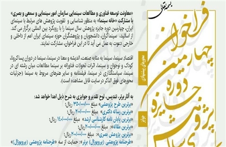 به گزارش روابط عمومیِ جایزه پژوهش سال سینمای ایران، در این فراخوان از استادان، سینماگران، دانشجویان و پژوهشگران حوزه سینمای ایران اعم از داخلی و خارجی دعوت به عمل آمده تا در این رویداد پژوهشی، شرکت نمایند.