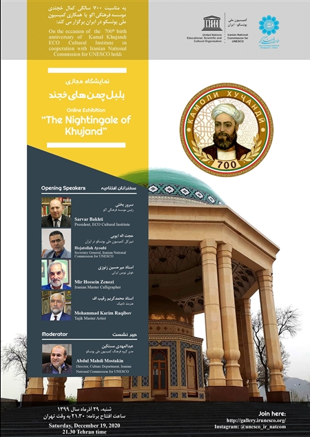 مؤسسه فرهنگی اکو با همکاری کمیسیون ملّی یونسکو - ایران به مناسبت هفتصدسالگی کمال خجندی، شاعر پرآوازه فارسی گوی نمایشگاه "بلبل چمن های خجند" را برگزار میکند.