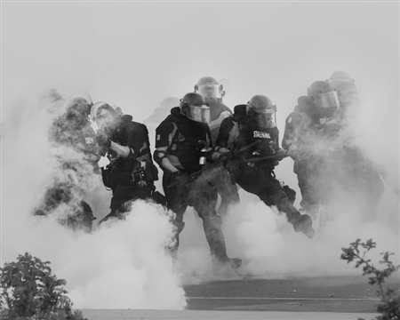این عکس را در مقابل ایستگاه حوزه پنجم اداره پلیس مینیاپولیس گرفتم، یک شب قبل از آن که معترضان چند ساختمان را در آن خیابان به آتش بکشند. اثری از ماموران به چشم نمی‌خورد و از بسیاری جهات پلیس کنترل شهر را از دست داده بود. با این حال افسران پلیس هر از چند گاهی با تجهیزات کامل به صورت گروهی از ایستگاه خارج می شدند تا معترضان را پراکنده کنند. به یاد دارم هنگام گرفتن این عکس بیرون ایستگاه بودم که یک گروه گارد ویژه از دیواری از دل گاز اشک‌آور بیرون آمدند. قبلا از موقعیت های مشابه در فرگوسن و بالتیمور هم عکس گرفته بودم اما پلیس مینیاپولیس واقع رویکردی بی‌رحمانی اتخاذ کرده بود. برای من این عکس نشان می‌دهد که نیروی پلیس در آمریکا تا چه حد نظامی شده است.